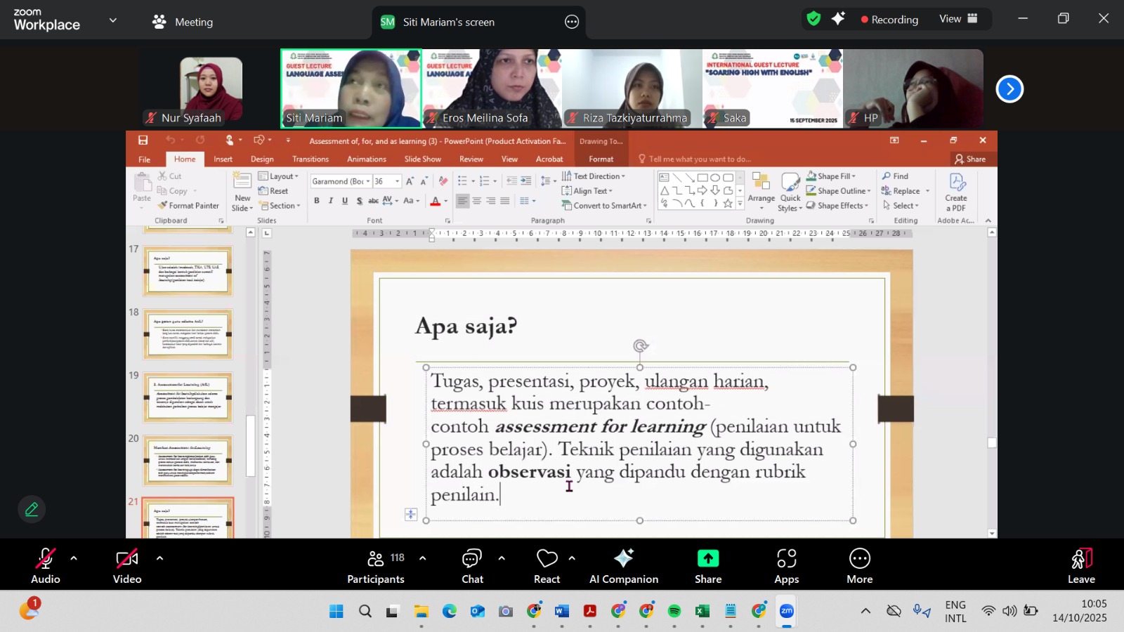Dalam kesempatan tersebut, Dr. Siti Mariam menyampaikan pentingnya memahami konsep dan praktik language assessment dalam dunia pendidikan bahasa Inggris.